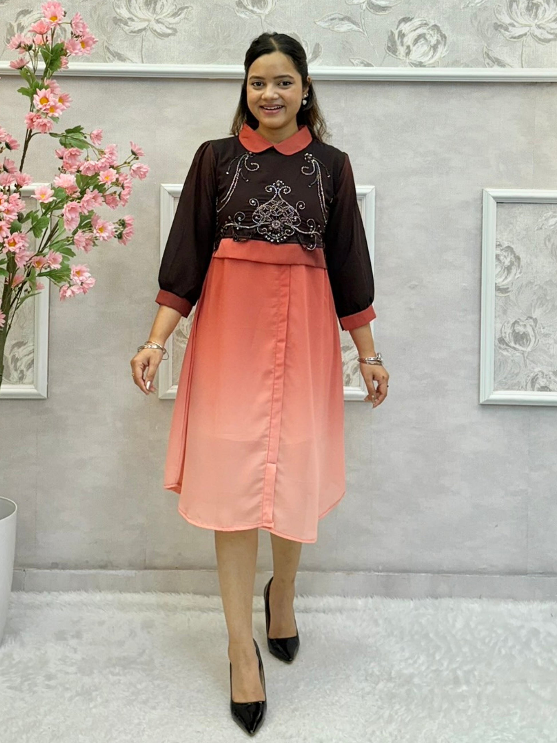 Make a graceful statement in this designer Indo-Western knee-length dress, crafted in georgette with an attached inner for comfort and coverage. Featuring a rich chocolate brown yoke with intricate handwork and a stunning peach ombre flare, this dress beautifully merges traditional embroidery with a contemporary silhouette. Perfect for festive evenings, brunches, or Indo-fusion gatherings.