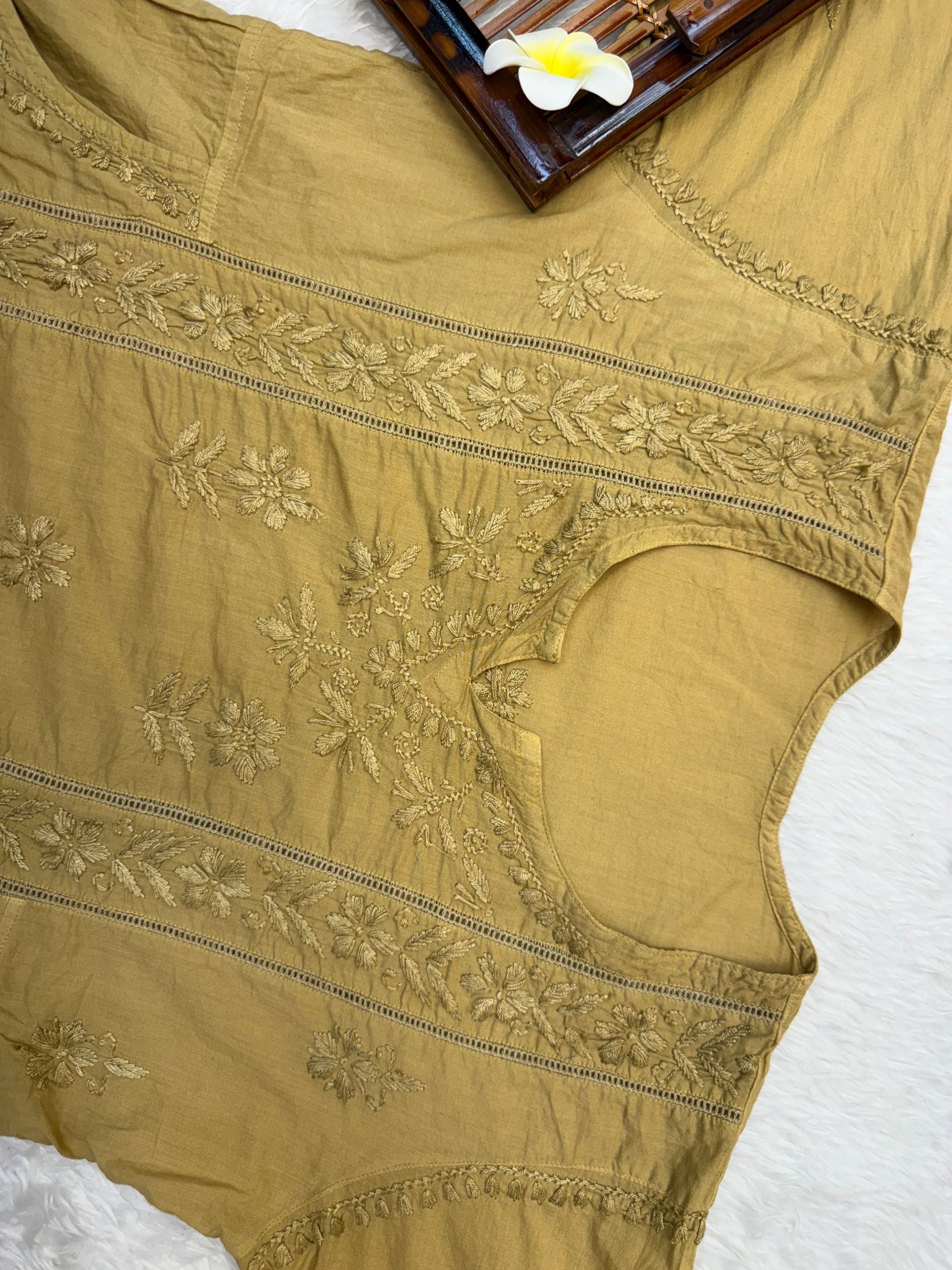 Lucknow Chikankari Mustard Cotton Pocket Style Short Kurta with Pant